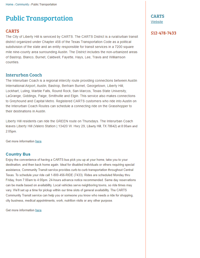 Whether you’re staying local, or exploring the surrounding cities, Liberty Hill offers fast and efficient public transportation. If your car is in the shop, you want to save gas money, or you just want to avoid rush hour traffic, take advantage of Liberty Hill's public transportation.