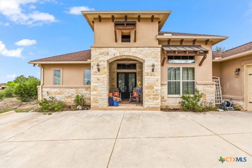Custom single-story home in Vintage Oaks at the Vineyard on a 1-acre lot with mature oaks. Stucco and natural limestone exterior with a xeriscaped front and curved concrete drive. Inside, an open floor plan connects the great room, kitchen, and dining areas. The great room features a floor-to-ceiling limestone fireplace and exposed wood beam ceiling. The kitchen offers custom espresso cabinetry, granite countertops and backsplash, a curved island with seating, oven/microwave combination, pro-grade gas cooktop with range hood, walk-in pantry, and a butler's bar. The primary suite includes a wood-inlay tray ceiling, sitting area, dual vessel-sink vanities, Jacuzzi tub, walk-in shower, and large walk-in closet. The two secondary bedrooms each feature their own private sink area and custom window cornices, sharing a Jack-and-Jill bath with tub and commode. A dedicated office, powder room, and laundry room complete the interior. Outdoors: a covered limestone-column patio with wood ceiling and ceiling fan, plus an extended flagstone patio with fire pit. The attached three-car garage features an insulated, walled-off third bay ideal as a shop or additional storage. Nestled in an established Hill Country community with native terrain and proximity to Canyon Lake. This custom-built, single-owner residence delivers quality craftsmanship on a generous, tree-studded acre. Schedule your showing today!