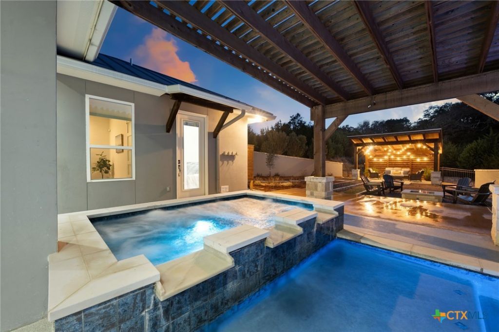Welcome to your private Hill Country retreat in the prestigious Oak Shores Estates of Canyon Lake, TX?an exclusive gated community offering luxury living just minutes from New Braunfels. This stunning 4-bedroom, 3-bathroom home delivers undeniable wow-factor, thoughtfully designed for entertaining and modern comfort. Step inside to soaring vaulted ceilings with exposed wooden beams that create a warm yet grand living space filled with natural light. The family room is enhanced with a built-in speaker system, creating the perfect atmosphere for entertaining or relaxing evenings at home. The chefs kitchen is truly the heart of the home, showcasing elegant quartz countertops, abundant prep space, and a spacious walk-in pantry. The oversized kitchen island features a striking underlit marble countertop, adding both sophistication and ambiance?perfect for hosting gatherings or casual family meals. Upstairs, a private balcony offers a peaceful setting to take in beautiful Hill Country sunsets. Built for efficiency and durability, the home includes a metal roof and tankless water heater, providing long-term value and modern convenience. The resort-style backyard is the ultimate showstopper, designed for year-round enjoyment. This outdoor oasis features a sparkling pool and spa, an elegant pergola for shaded relaxation, an inviting fire pit for cozy evenings, and a fully equipped outdoor bar area ideal for entertaining friends and family. Whether hosting a crowd or enjoying a quiet night under the Texas sky, this backyard delivers the ultimate lifestyle experience. Located in the secure, gated community of Oak Shores Estates, youll enjoy privacy and exclusivity while remaining conveniently close to shopping, dining, and entertainment in New Braunfels, along with the recreation and natural beauty of Canyon Lake. This is more than a home?its a lifestyle.
