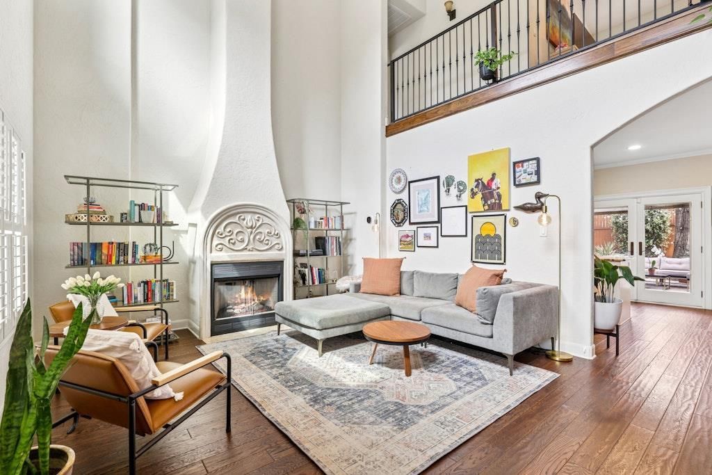 Tucked beneath mature heritage trees on a quiet street in Travis Heights, this modern Mediterranean residence blends warmth, privacy, and timeless sophistication. Set back behind low-maintenance xeriscaping and steel-edged planters, the home makes a striking first impression and continues with soaring ceilings, arched passageways, rich hardwood floors, and expansive windows that bring in abundant natural light.A dramatic two-story living room flows seamlessly into the open kitchen and dining area, ideal for gathering and entertaining. Double ovens, a generous center island, and custom cabinetry offer both function and style. With four bedrooms, four full baths, and two spacious living areas, the layout provides flexibility for guests, work-from-home needs, or everyday living.The primary suite offers a private retreat with its own balcony and dual walk-in closets, creating a quiet escape within the home. Enjoy life in Travis Heights just moments from Big and Little Stacy Parks, neighborhood trails, South Congress, and downtown.