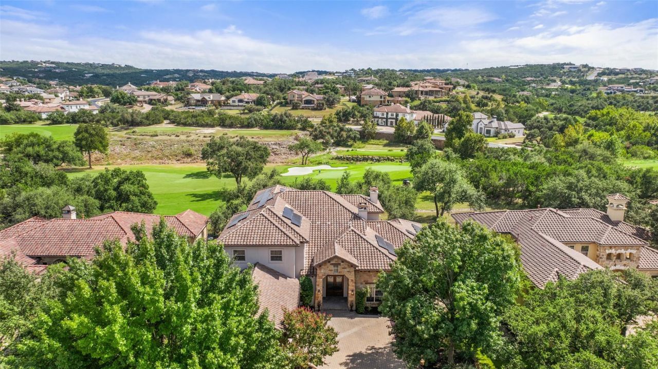 Inside the gates of Flintrock near Lake Travis is a stunning executive home set amidst Live Oaks above the 10th green of the Flintrock golf course. This luxurious 5-bed, 5.5-bath home boasts rich woods, natural stone, and top-tier finishes. The open-concept living and resort-caliber outdoor spaces make it ideal for entertaining. Guests are welcomed by custom wood + glass doors into a grand living room w/23-foot wood-beamed ceilings + retractable glass walls, revealing views of the infinity pool + golf course. A floor-to-ceiling stone fireplace anchors the space, while Alder bookcases + travertine marble floors add both elegance and durability. The gourmet kitchen features Alder cabinetry, granite counters, marble backsplash and high-end appliances, including a Blue Star gas range w/double ovens. Additional features include a whole-house water filtration, a butlers pantry + a spacious walk-in pantry. The executive office is adorned with a coffered wood-beamed ceiling, and the expansive dining room can accommodate twelve guests. The owners suite includes a private sitting area, tray ceilings, recessed lighting, and panoramic views. Its spa-like bath has marble counters, a soaking tub, a frameless glass shower, and a large walk-in closet. The guest suite offers a flex space with a Murphy bed, a desk, and a full bath with pool views. Outside, the screened living area includes a stone fireplace, Blaze grill, and negative-edge pool with LED lighting and fountains. A flat lawn with Emerald Zoysia grass completes the outdoor retreat. Upstairs are three large guest rooms, each with en-suite baths, and a game room with a built-in bar and a covered balcony. The home also includes a 3-car garage, a fully wired ELAN smart home system + 16Kw solar system to reduce electricity bills. Residents of Flintrock enjoy 24/7 gated access, social privileges at the Hills Country Club, and proximity to Lake Travis schools, shopping, and dining.