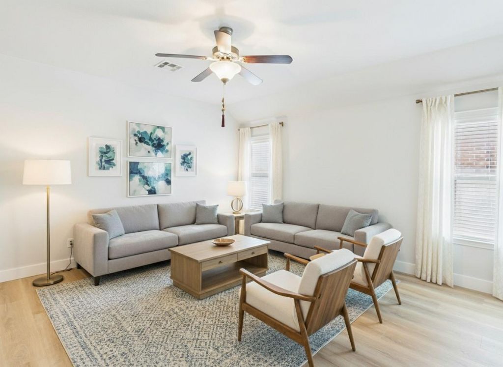 Welcome to your pristine retreat in Budas sought-after Stonefield community! This beautifully maintained home boasts a desirable mother-in-law floor plan, perfect for privacy and modern living. Youll find a fresh, contemporary feel throughout with brand-new flooring, crisp paint, and updated recessed lighting. The heart of the home is the generous living area, with an open, airy footprint thats perfect for hosting friends or for quiet movie nights. Retreat to the oversized primary suite, a true sanctuary featuring a walk-in closet and a spa-like bath with dual vanities, a soaking tub, and a separate walk-in shower. Enjoy the peace of having no direct neighbor to the east, offering a more private feel. Location is everything here: take a short stroll to the community walking trails, playground, and mailbox, or hop on I-35 for an easy commute. This one is truly turnkey and ready for you!