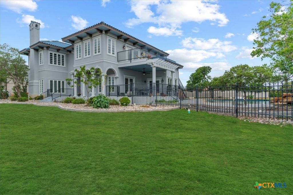 Perched in the exclusive, gated Kings Point enclave?where brick-lined streets wind through the Texas Hill Country?this 4,574-square-foot residence blends luxurious finishes with a warm, comfortable spirit. Sun-splashed interiors frame beautiful Canyon Lake views from numerous rooms and multiple balconies, creating an effortless connection to the water and rolling hills beyond. A gracious foyer opens to generous living and dining spaces designed for entertaining and everyday ease. The recently remodeled kitchen is the showpiece: sleek stone countertops, Thermador ovens, a dedicated ice maker, abundant storage, and a large working island set the stage for memorable meals. Nearby, a light-filled family room and casual dining area flow to the terraces for al fresco moments overlooking the pool. Six private bedrooms?all with ensuite bathrooms?offer restful retreats for family and guests, complemented by two well-placed powder rooms. An elevator provides easy accessibility to the second floor, and a secondary laundry adds day-to-day convenience. Flexible bonus areas accommodate a playroom, fitness space, or quiet office as needs evolve. Out back, resort living takes center stage. The sparkling pool features a relaxing spa and a cascading waterfall, while the outdoor shower and surrounding patios invite long, lingering afternoons. Thoughtful details include a whole-house vacuum system, ample storage, and a layout that welcomes multigenerational living or extended-stay guests. Morning coffee on the balcony, sunset cocktails by the pool, and starlit gatherings come naturally in this serene setting. With quick, central access to Austin, San Antonio, and New Braunfels, weekend adventures and weekday commutes are equally convenient. A rare offering in Kings Point?equal parts refined and inviting.