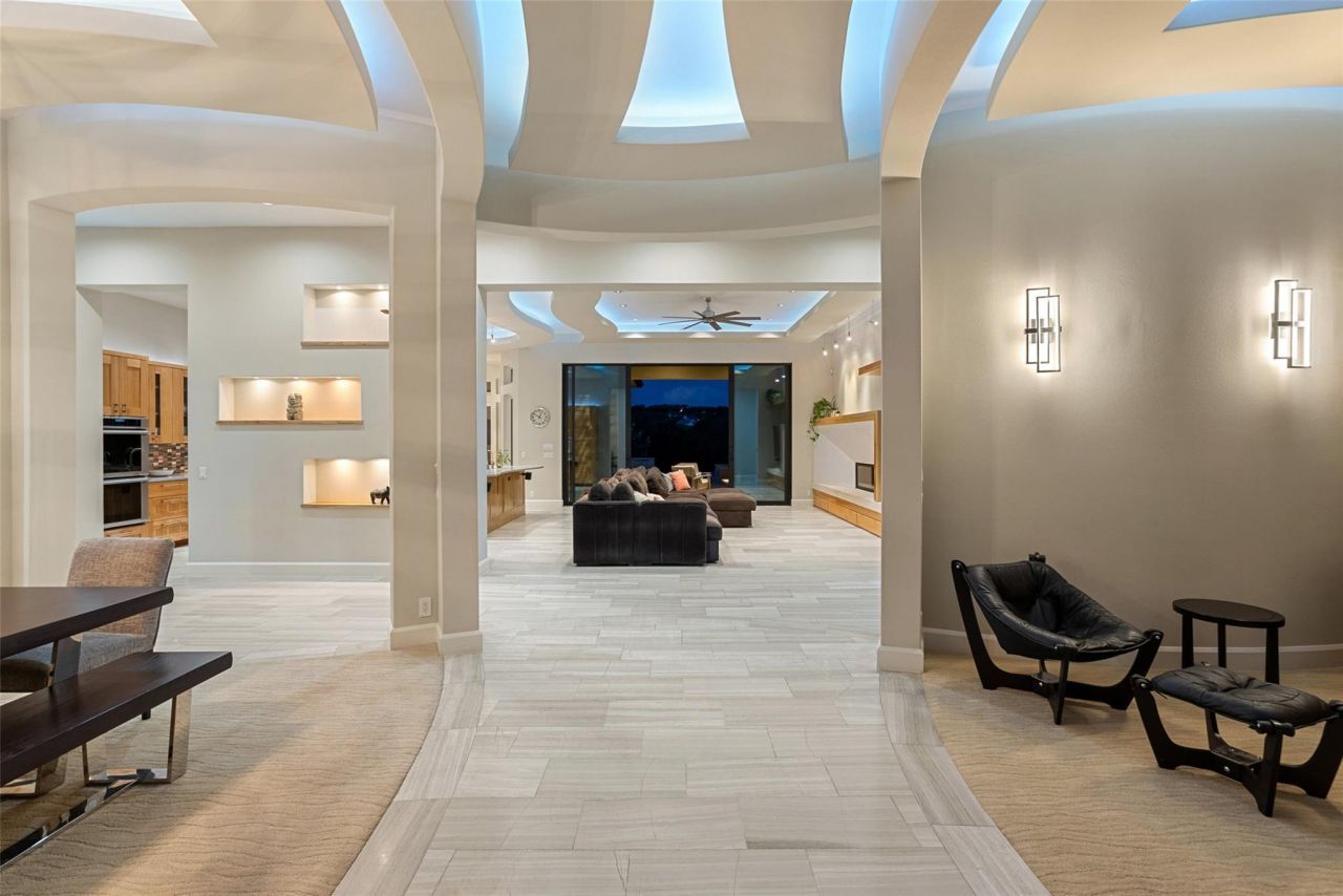 Welcome to a haven of Hill Country living in a gated community on 1.3 acres, where contemporary design and nature unite in perfect harmony. This exceptional estate includes a single-story 3,816 sq ft custom residence w/ oversized 3 car garage, plus a newly completed ~1,600 sq ft climate-controlled garage + office addition?offering 5+ total garage bays with option for lifts, ideal for a car enthusiast or creative professional. Capturing panoramic views, this one-of-a-kind custom home blends natural materials with refined modern architecture. The grand entry leads to graceful curves, wood accents, soaring ceilings, lighted niches, and a striking fireplace, creating an ambiance of serene sophistication. An open layout includes multiple living & dining areas. Walls of windows and expansive sliding doors invite the scenic outdoors in. Backing to a greenbelt, the private backyard retreat features a 2023 Keith Zars heated pool & spa, outdoor kitchen, & sprawling covered patio. Chefs kitchen showcases dual islands, a breakfast bar, built-in Thermador appliances (double ovens, coffee maker, ice maker), a butlers pantry w/ wine fridge, & alkaline faucet. The primary suite opens to the pool and views, with a spa-inspired bath offering a walk-in shower, freestanding tub, triple vanities, & dual closets. Additional highlights include a built-in sound system, EV charger, central vacuum, whole-home water purification, & smart home automation. Sustainability and security shine with a rainwater collection system, solar panels with Tesla Powerwall backup, custom screened doors. The new detached Garage + Office Retreat features showroom lighting, a 2-car lift-ready bay, EV plugs, kitchenette/lounge, soundproof room, offices, full bath, and workshop area?blending luxury with precision and performance. Set within the prestigious Belvedere community, residents enjoy a clubhouse, resort-style pool, lazy river, fishing pond, trails, and nature preserve?Hill Country luxury at its finest.