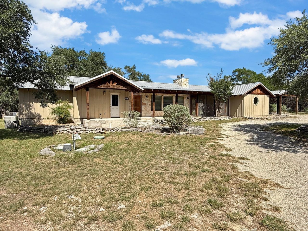 Peaceful Hill Country Escape -Wimberly Texas- Tucked away on 3 serene acres of Oak Cedar trees. This charming Hill Country retreat offers the perfect blend of comfort and nature, The home has 2 bedrooms and full .bathrooms, it's ideal for couples, families or friends to unwind.The open concept living area features stained concrete floors, a cozy double sided fireplace and a fully equipped kitchen with modern appliances. Enjoy the Texas breeze from the screened in dog trot patio, which connects the main home to a private guest suite - perfect for added privacy. What you'll love:* Private access to the Blanco river * Just 9 miles to downtown Wimberly and 18 miles to Blanco* Close to Fischer Dance hall and Devil's Backbone Tavern* Easy day trips to Fredericksburg, Johnson City and Canyon Lake* Star filled skies and total tranquility